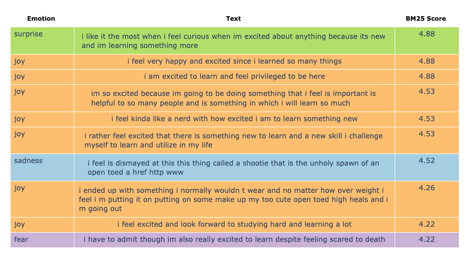 Out of the 10 returned texts, displayed above in a table plot, 2 are poor matches to our search input; likely due to BM25 scoring being skewed by common terms or differences in document length.